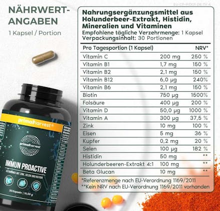 *Laut der EFSA (European Food Safety Authority) tragen Vitamin B6, Folsäure, Vitamin B12, Vitamin C und D sowie Zink, Selen und Eisen zu einer normalen Funktion des Immunsystems bei.