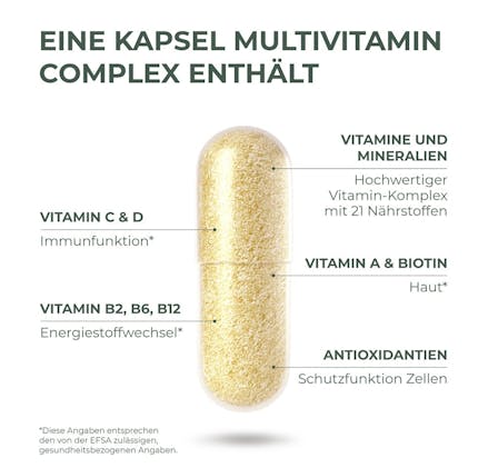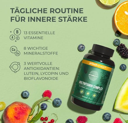 Ein starkes Immunsystem ist essenziell für ein gesundes Leben. Multivitamin Complex enthält eine ausgewogene Mischung aus Vitaminen und Mineralstoffen, die deine Abwehrkräfte stärken und dich vor Krankheiten schützen. Besonders in stressigen Zeiten und bei ungesunder Ernährung kann das Immunsystem geschwächt sein. Multivitamin Complex hilft dabei, es zu unterstützen und deine Gesundheit zu bewahren.