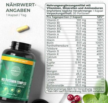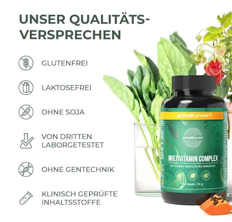 Ein gesunder Körper braucht eine Vielzahl an Nährstoffen, um optimal zu funktionieren. Multivitamin Complex bietet eine umfassende Versorgung mit Vitaminen und Mineralstoffen, die zu deinem allgemeinen Wohlbefinden beitragen. Viele Menschen leiden unter einem Mangel an essentiellen Nährstoffen, der zu verschiedenen gesundheitlichen Problemen führen kann. Multivitamin Complex hilft, diese Mängel zu beheben und sorgt für dein allgemeines Wohlbefinden.