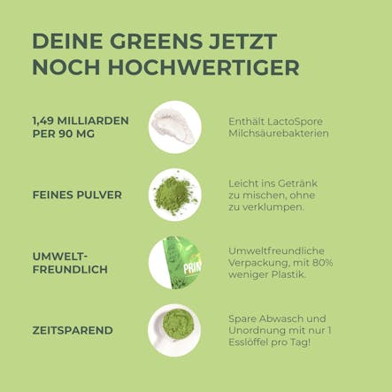 Greens Pulver sind eine Quelle für natürliche Energie und können dabei helfen, das Wohlbefinden zu steigern und das Energieniveau zu erhöhen.