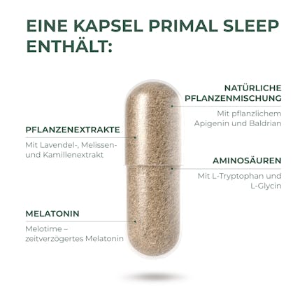Ein gutes Abendritual kann beeinflussen, wie erfrischt und klar du in den Tag startest. Primal Sleep enthält eine moderne Komposition natürlicher Inhaltsstoffe wie Melatonin, Aminosäuren und natürlichen Kräutern und Pflanzen, die häufig in Verbindung mit Entspannung und Ausgeglichenheit gebracht werden.