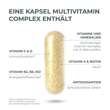 Ein starkes Immunsystem ist essenziell für ein gesundes Leben. Multivitamin Complex enthält eine ausgewogene Mischung aus Vitaminen und Mineralstoffen, die deine Abwehrkräfte stärken und dich vor Krankheiten schützen. Besonders in stressigen Zeiten und bei ungesunder Ernährung kann das Immunsystem geschwächt sein. Multivitamin Complex hilft dabei, es zu unterstützen und deine Gesundheit zu bewahren.