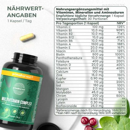 Ein gesunder Körper braucht eine Vielzahl an Nährstoffen, um optimal zu funktionieren. Multivitamin Complex bietet eine umfassende Versorgung mit Vitaminen und Mineralstoffen, die zu deinem allgemeinen Wohlbefinden beitragen. Viele Menschen leiden unter einem Mangel an essentiellen Nährstoffen, der zu verschiedenen gesundheitlichen Problemen führen kann. Multivitamin Complex hilft, diese Mängel zu beheben und sorgt für dein allgemeines Wohlbefinden.
