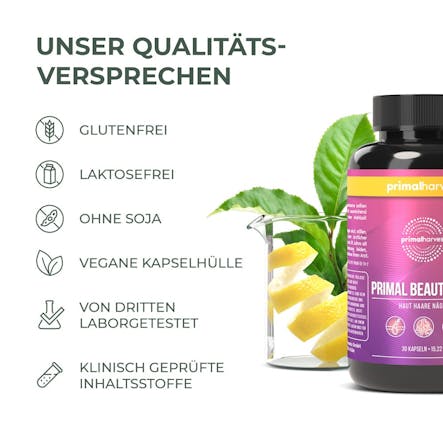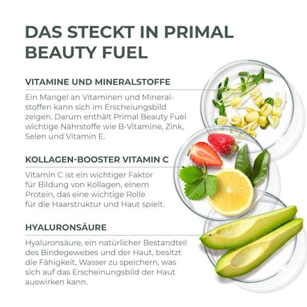 Gesundes und kräftiges Haar beginnt von innen. Primal Beauty Fuel enthält Biotin, Zink und andere essentielle Nährstoffe, die das Haarwachstum fördern und die Haarstruktur stärken.