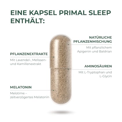Ein gutes Abendritual kann beeinflussen, wie erfrischt und klar du in den Tag startest. Primal Sleep enthält eine moderne Komposition natürlicher Inhaltsstoffe wie Melatonin, Aminosäuren und natürlichen Kräutern und Pflanzen, die häufig in Verbindung mit Entspannung und Ausgeglichenheit gebracht werden.